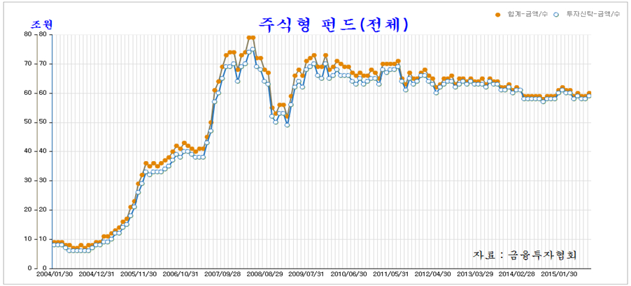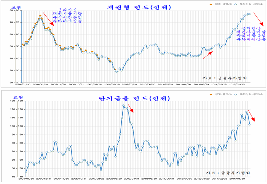이 과정에서 2012년 이후 채권형 펀드에는 40조원 가까운 돈이 몰려 넘칠 정도로 찰랑찰랑하고, 단기금융 펀드에도 50조원 넘는 자금이 유입되며 120조원으로 찰랑찰랑한 수준이다. 그러나 이런 자금은 경기가 좋아지고 금융시장의 우려가 사라지면 마치 불이 난 극장에서 빠져나오려고 앞을 다투는 사람들처럼 서로 앞을 다투기 마련이다.