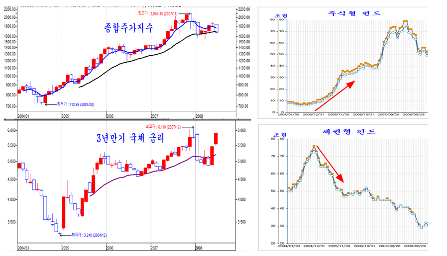 이럴 때 주가가 어떻게 움직일까? 여러분은 이미 2004년부터 2008년까지 주가가 매우 크게 올랐다는 것과, 2009 ~ 2010년 단기 자금이 이탈할 때 주가가 급등했다는 결과를 알고 있다. 다음은 2004년 ~ 2008년의 금리 변화와 주가 변화 그리고 주식형 펀드와 채권형 펀드의 자금 흐름이다.