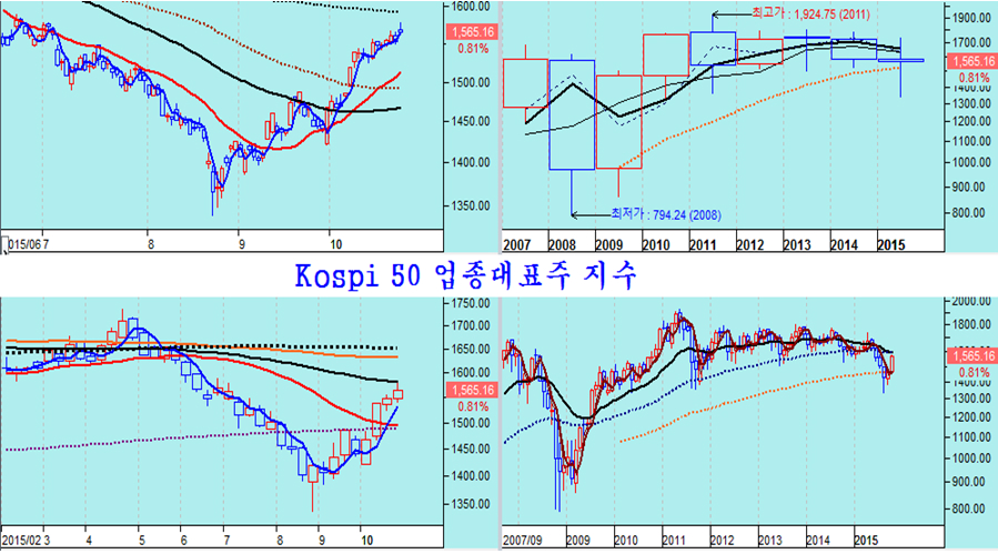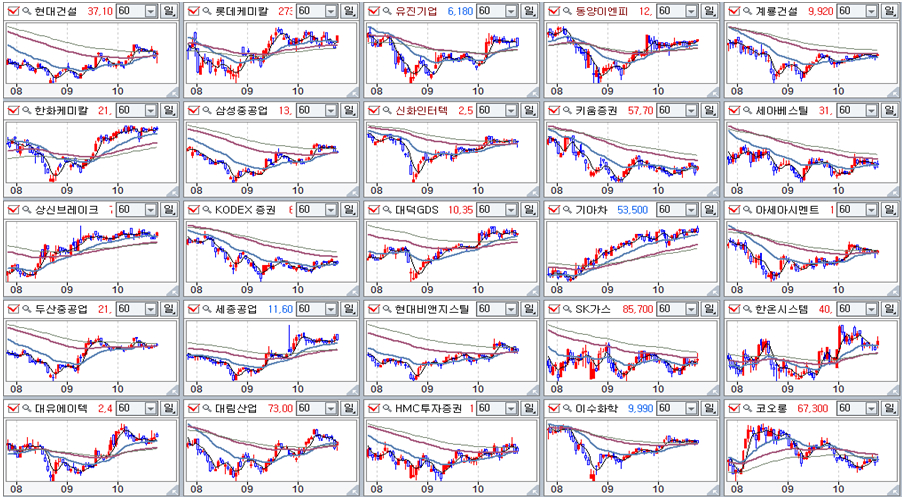 시장은 업종을 대표하는 대형 우량주를 중심으로 상승이 전개되고 있으므로 대응하기 쉬운 장세이다. 바닥권에서 차분히 올라오는 이런 기업들을 주중 또는 월중 저가를 가늠하여 매수해 두고 보유하고 가면 알기 쉽다.