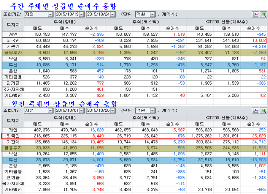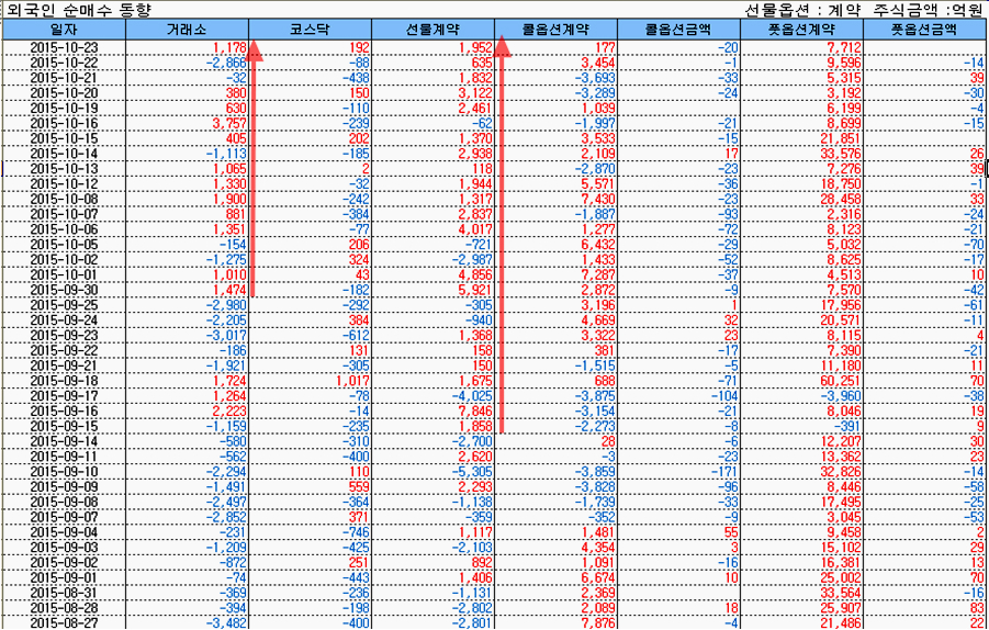 순매수 동향을 보면 외국인은 9월 중순부터 적극적으로 선물을 사들이며 향후 장세에 대한 주식 매수를 예약하고 있고, 4분기가 시작되면서 적극적으로 주식을 사서 늘리고 있다. 다만, 개인이 옵션으로 상승에서 이익을 내려고 하자, 이 포지션에 대응해서 포지션을 취하고 지수를 움직이는 대형주를 이용해 지수의 상승 속도를 조절함으로써 지루한 느낌을 갖게 하고 있다.