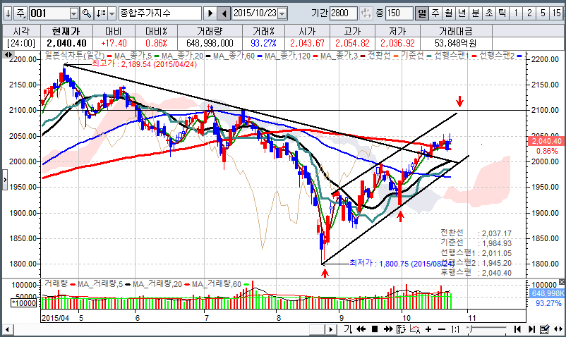 코스피지수는 기술적분석상 상승 채널 구조로 보면 2100p까지 상승 가능성은 열려있다.