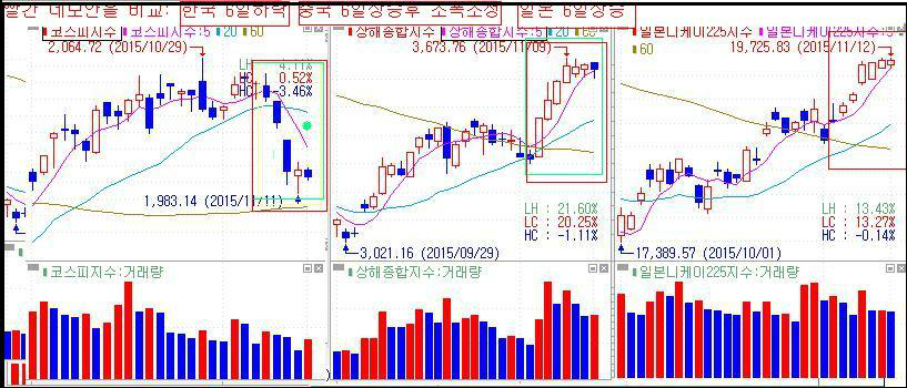 위의 빨간네모 안을 보세요. 처음이 코스피 두번째가 중국증시 세번쩨가 일본증시이다. 위의 차트를 보고 느끼는 점이 없는지? 3국중 경제사정이 가장 좋은 국가가 어디인가? 단연 대한민국이다. 그런데 이상하다. 대한민국증시는 6일간 차트에서 하락했고 상해는 상승하다가 오늘 약간 조정이고 일본은 계속 상승했다.