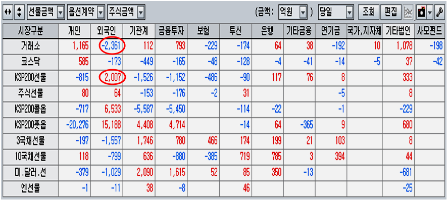 지난주로 옵션 만기가 끝나면서 상승을 준비하는 전략을 가져가고 있다. 현물 시장보다 선물과 옵션의 파생상품을 쉽게 구입할 수 있기 때문에, 월요일 주식을 대형주 위주로 2361억원 규모로 줄기차게 팔면서 한편으로는 선물을 매수하고 옵션에서는 상승을 준비하는 포지션을 유리하게 확보했다.
