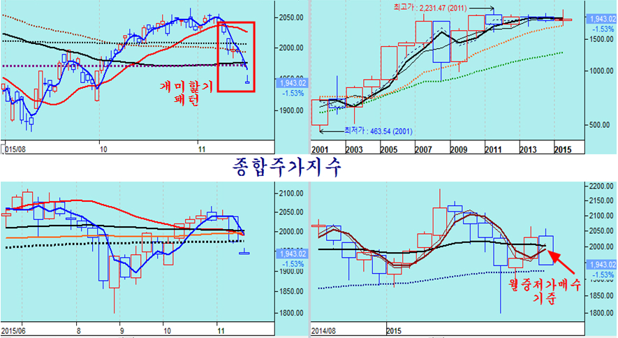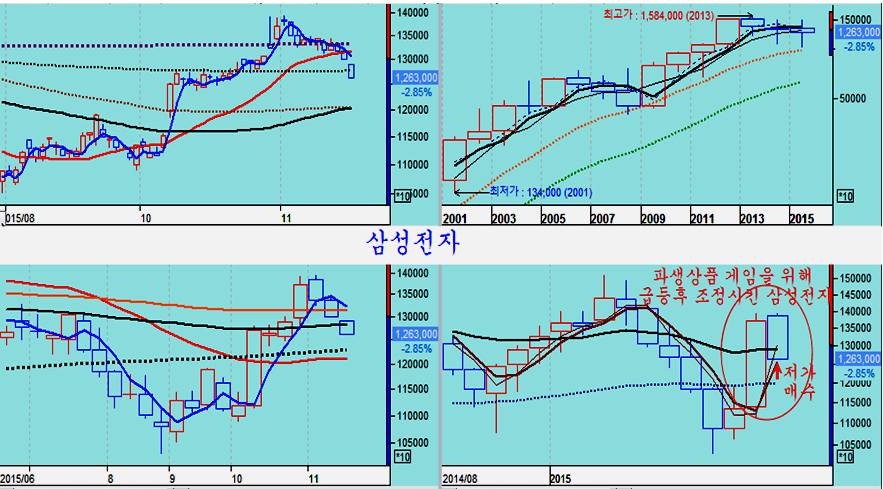 10월 지수의 상승과 11월 지수의 조정은 삼성전자를 이용한 파생상품 게임의 성격이 짙다. 외국인은 10월 삼성전자를 사서 급등시킨 후, 개인이 뒤따라 오는 것을 이용하여 삼성전자를 조정시켜 하락에서 이익을 취했다. 삼성전자의 급등과 급락 때문에 파생상품 시장에서는 쉽게 이득을 취할 수 있는 모습이 되었고, 삼성전자 주가가 월봉 시가 3선에 접근하면서 지수도 상승할 위치에 다가서 있다.