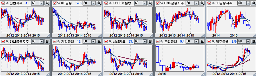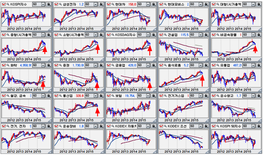 중형주, 소형주, 코스닥 지수는 비금속광물, 음식료, 통신업, 전기가스업과 함께 월봉 기준 20월 평균에 접해 있다. 실적이 안정적으로 성장하는 기업은 주가가 20개월 평균에 접하면 연중 저점에 해당하는 매수의 위치이다.
