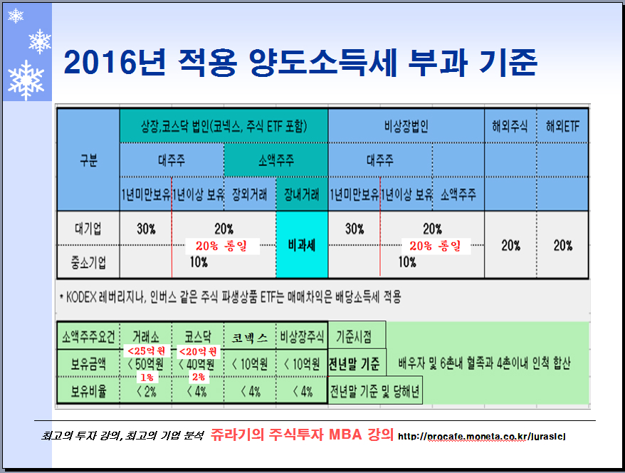 올해까지 주식 매매차익 양도소득세 부과 기준은 거래소 지분율 2%에 종목보유금액 50억원, 코스닥 지분율 4%에 종목보유금액 40억원이었다. 그러나 2015년 세법 개정이 이뤄지면서 내년도 양도소득세 부고 기준은 거래소 지분율 1%에 종목보유금액 25억원, 코스닥 지분율 2%에 종목보유금액 20억원으로 변경된다. 문제는 내년도 2015년 말 보유를 기준으로 내년도 양도소득세 부과가 이뤄지므로 올해 연말에는 양도소득세를 피하기 위해 매도할 대상이 훨씬 늘었고 매도해야 할 금액도 커졌다고 할 수 있다.