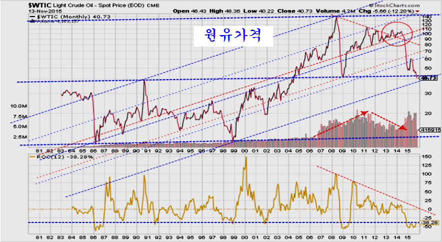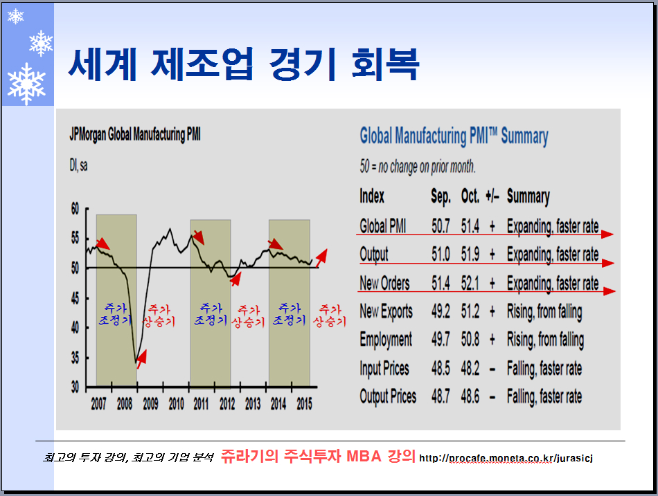 통상 제조업 경기의 영향을 받는 원자재 가격은, 2014년초 세계 제조업 경기 둔화와 함께 주가가 장기로 조정이 이어졌다. 그러나, 11월을 기점으로 세계 제조업 PMI가 의미 있는 증가를 보임으로써 세계 제조업 경기 회복 기대가 큰 곳에서 원자재 가격은 오히려 하락했다는 점에서 비상식적인 주가 흐름이 전개되고 있는데 통상 이런 비상시적인 주가 움직임은 멋진 기회가 된다.
