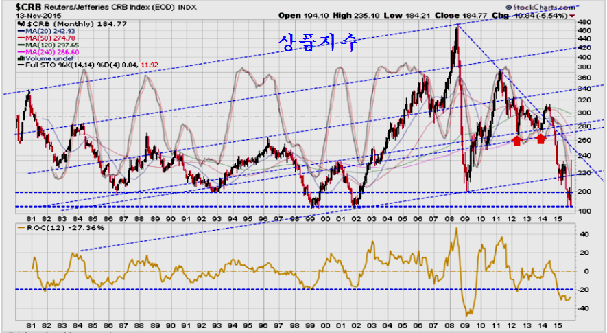 10월 초 상승했던 에너지, 금속, 귀금속이 10월 중순 이후 달러 강세와 함께 지속적으로 하락하면서 이와 관련한 업종, 에너지, 철강, 기계, 해운의 주가도 한달 여 조정을 거치고 있다. 이 조정과 함께 상품지수는 35년 변동 구간 중 최저가격권에 이르러 상승이 기대되는 위치이다.