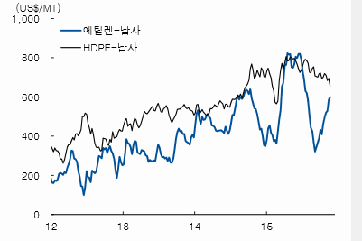 에틸렌 생산을 주력으로 하는 화학사 주가 상승 높다