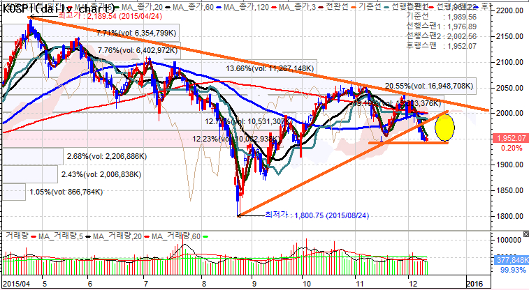 코스피지수가 3개월 추세라인을 하향 이탈하였고 장단기 이평수렴이후 하향 이탈로 하방압력을 받는것은 사실이다. 다만 단기적으로는 단기 급락에 따른 기술적 반등 가능성에 무게를 둔다.