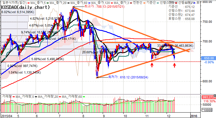 코스닥지수 역시 최근 3개월간의 추세라인을 훼손하면서 저점 확인이 필요한 상황이나 지난 11월 저점 전후에서 기술적반등 가능성이 높아보이며 이후 박스권 등락이후 방향성을 결정하게 될것이다.