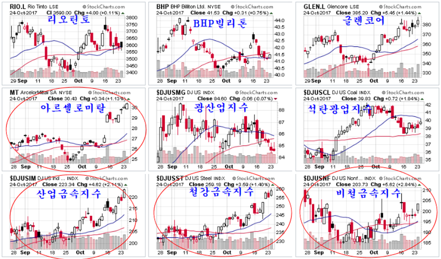 세계 광산업 1,2,3위를 차지하는 리오틴토(영국 런던시장), BHP빌리톤(뉴욕시장), 글렌코어(영국 런던시장) 중 글렌코어가 견실한 상승이 이어지고, 세계 철강업 1위기업 아르셀로미탈은 핵심구조도의 제2선 저항을 넘어 상승이 시작되고 있다. 아르셀로미탈이나 광산업 기업들은 직접 투자해도 좋은 기업들이다.