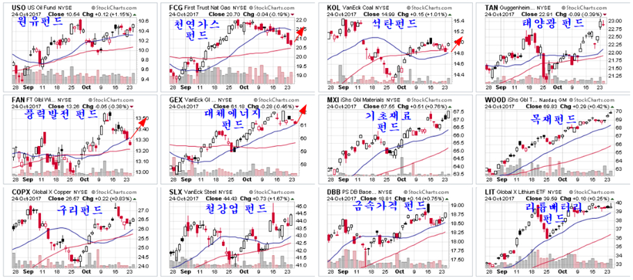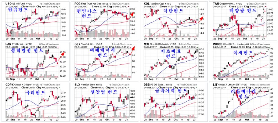 세계 화학, 금속, 비금속 광물을 포함하는 기초재료 펀드 MXI가 매우 안정적인 상승 추세가 이어지고 있으며, 목재펀드 WOOD는 12개월 이상 상승이 이어지는 견실한 상승세가 진행 중이다. 미국과 캐나다 등 대부분의 주택이 목재를 이용하여 건축하기 때문일 것이다.
