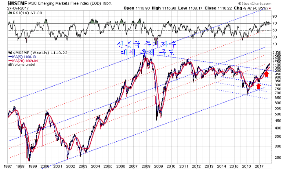 이 선진국과 신흥국 두 블록의 경기의 흐름을 본다면 향후 이 지구촌의 경기가 어떻게 움직일지를 알 수 있고, 향후 수년에 걸쳐 주가가 어떻게 움직일지를 예상하는데 어렵지 않다. 한국은 비록 정부의 잘못된 정책으로 내수가 위축되어 있지만 수출을 주력으로 하는 산업구조로 세계 경기와 함께 기업 성장의 기회가 시작되고 있다.