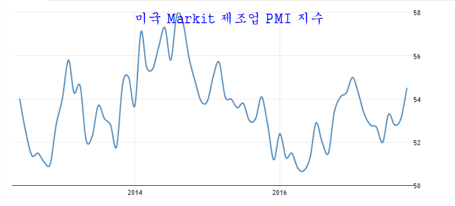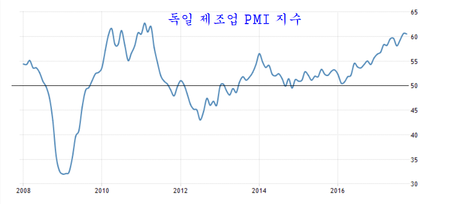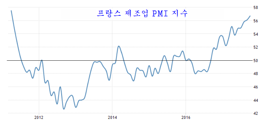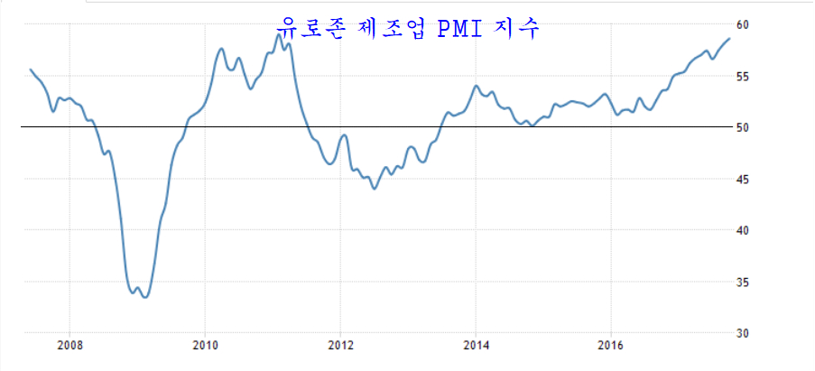 다음은 10월 미국, 유로존 19국, 독일, 프랑스, 일본의 제조업 PMI 지수이다. 세계 경제의 핵심국가들의 제조업 경기가 2000년 이후 최고의 활황을 향해 지속 호전되고 있다. 50을 넘으면 경기 확장 국면으로 판단하는 PMI 지수는 지난 20년래 최고 지수를 향해 가고 있다.