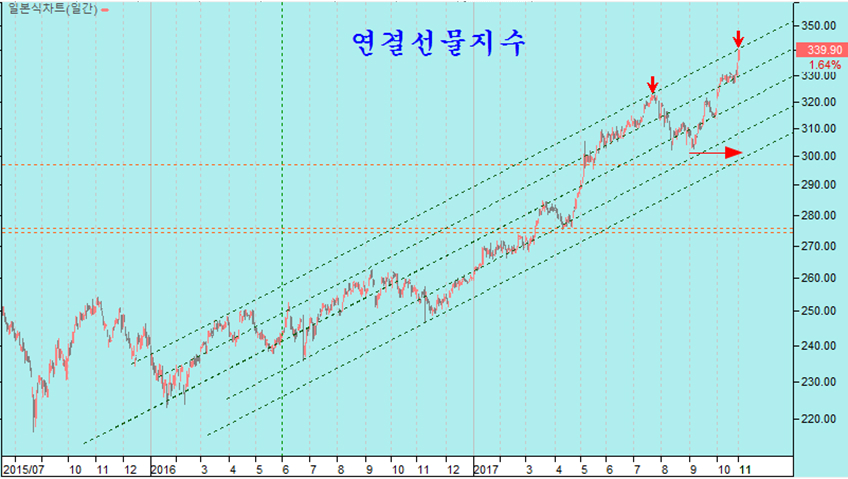 선물 시장을 움직이는 외국인은 최근 3일 뉴욕시장과 한국시장에서 기술주를 매수하며 지수를 급등시켰지만 11월 1일로 대단원의 막을 마무리하는 듯 하다. 연결선물지수는 2016년 이후 상승 추세의 채널 천정에서 마감함으로써 지수 상승의 전환점이 될 가능성이 높다.
