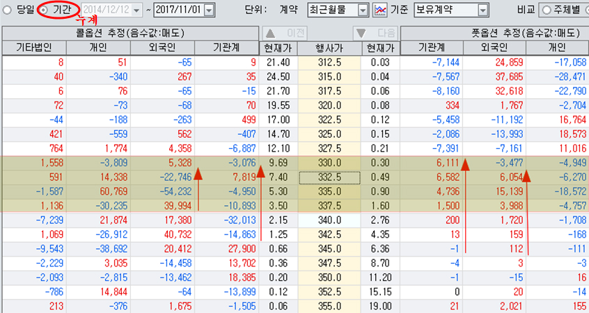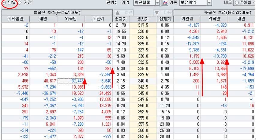 다음주 목요일 옵션 만기를 앞둔 옵션 시장에서는 대규모 베팅이 이뤄졌다. 외국인은 행사가 340 콜옵션을 대규모로 매도한 대신 332.5 이하 풋옵션 매수를 늘렸고, 기관도 337.5~342.4 행사가의 콜옵션을 팔고 330 이상의 풋옵션을 매수하였다.
