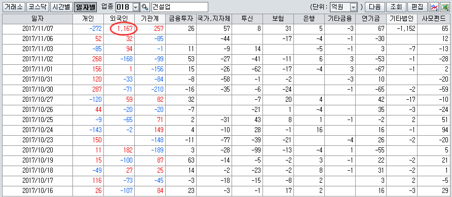 오늘 외국인은 2441억원의 주식 순매수 물량 중 건설업에 1167억 원의 순매수를 집중했다.