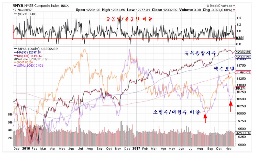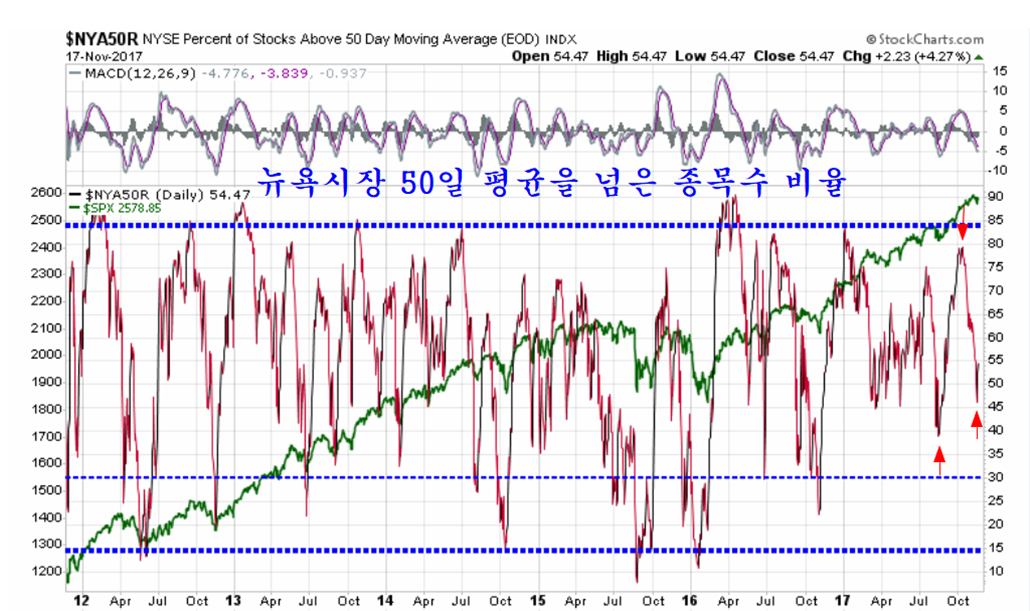 뉴욕시장에서 시장의 등락 양상을 나타내는 50일 평균을 넘은 종목수의 비율은, 9월 말 80% 수준으로 오른 후 이후 하락 종목수가 증가하며 46%로 내려선 후 다시 상승 종목의 수가 증가하기 시작하고 있다.