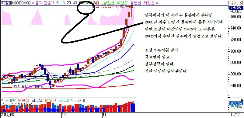 아래는 현재 서있는 자리에서 코스닥 월봉,주봉,일봉 차트에 대한 해석입니다.