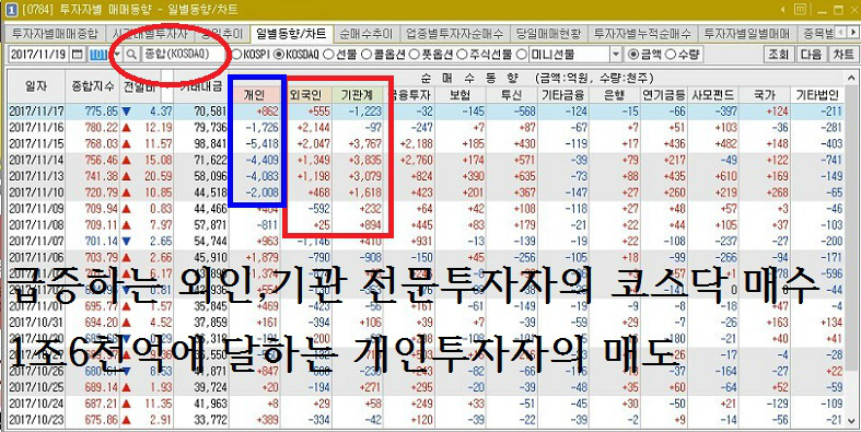 아래는 코스닥 시장에 대한 배팅을 진행중인 전문투자자의 매수규모입니다.