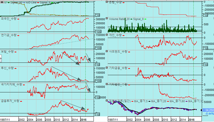 장기적으로 매출이 증가하면서 이익이 안정되는 기업은 연봉을 기준해 주가가 상승하는 점에 비추어 매우 이례적인 케이스이다. 그러나 매도를 주도했던 기관들의 매도 물량의 거의 완전한 소진과 함께 주가는 대세 추세의 바닥권이다.