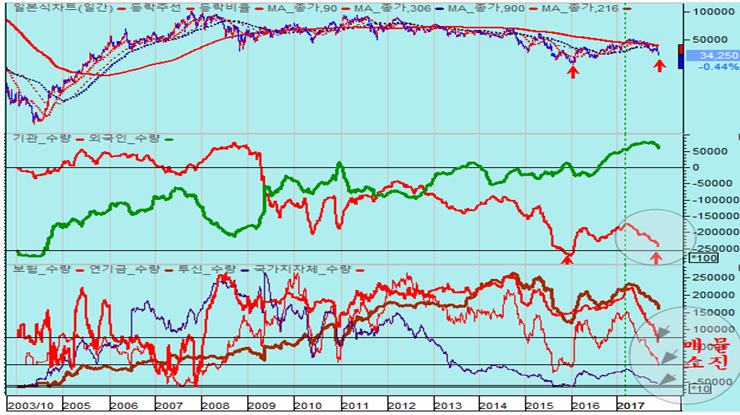 2010년 이후 주가 하락이 증권, 투신, 보험, 국가지자체, 은행 등의 기관의 매물에 의해 이어져왔으나 이들의 매도 물량이 거의 완전히 소진됨으로써 주가는 주도 매집 세력인 외국인의 의도에 따라 장기 상승할 조건을 갖추었다.