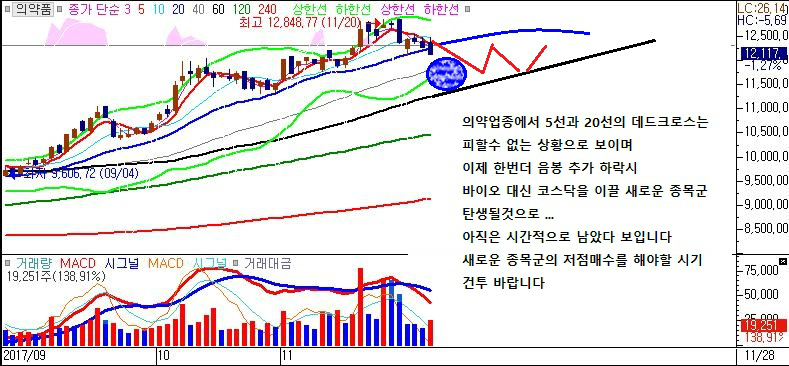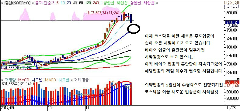 최고의 계좌관리를 위해__1차익절[보유물량50%]매도리딩__을 진행하는 황소투자클럽입니다 최근 코스닥시장이 어지럽다.사실 알고보면 당연한 일이라할수있겠다. 업종을 끌고가던 대장주의 흐름이 밀리게 된다면 전체 주변주로 그 파문이 전달되면서 하락매질파동이 진행되기 마련이다. 생각해보면 불과 7개월전 시총 5천억대의 회사가 시총 10조원대를 육박했다면 이는 필연적으로 하락조정의 순간이 다가오고 있음을 의미한다. 하지만 그것이 고점이라는 생각보다는 상승하고 있는 관성의 법칙으로 인해 대다수의 사람들은 추가상승을 기대한다.사실 알고보면 단순한 일인데도 애써 잊으려 한다. 1만원의 시총을 3만원으로 견인하는데 100억이 필요하다면 3만원을 9만원 까지 견인하는데는 300억이 아닌 1200억이 필요하다는 사실을.. 1만원에서 매수한 투자자는 3만원을 목표가로 보면 200%이나 2만원 투자자는 겨우 50%의 수익을 보기위해 100%를 오른 종목을 매수해야 한다는 사실을.. 욕심이 죽어야 계좌가 산다. 주봉 차트 관점으로 보면 새로운 종목군의 본격 탄생은 다음주 중반 이후로 보여집니다 그때즈음이면 의약품업종역시 추가하락을 멈추는 시점으로 보이고 60선 상단에서 20선과 60선이 얽히며 5선이 수평각으로 돌기 시작할것으로 보입니다. 최고의 저항선을 돌파후 하나의 음봉으로 조정이 마감될것이라 믿어지진 않기 때문에 다음주 아랫꼬리 음봉이 필요하다고 보여지는 시점입니다. 한국은행의 금리인상까지 기다리고 있어 단기 흔들림이 가속화될수 있음을 생각해본다면 이번주 주봉음봉마감후 다음주 이랫꼬리 주봉음봉 혹은 작은 망치형 양봉이 나타나는지 확인하면서 저점매수를 진행해야 할것으로 보여집니다. 지금은 저점매수를 진행하면서 다가올 다음 급등업종을 기다릴 시점입니다.