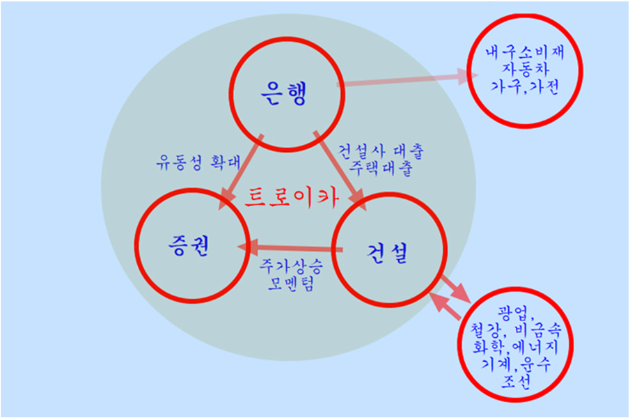 은행업은 주택구입과 주택 건설로 대출이 늘고, 주택건설을 위한 철강, 화학재, 석재, 골재, 목재 등의 자재 운반과 운송에 필요한 에너지 운송, 조선, 기계 등 업황이 활황이 되면서 공장 건설이 늘기 때문에 활황이 된다. 아울러 주택 건설과 거래, 건설에 관련된 원자재에서 건자재에 이르는 다양한 산업, 그리고 은행업이 업황이 호전되므로 증시가 상승하며 증권업이 함께 활황이 되어 건설-은행-증권은 불가분의 연결관계가 된다. 그래서 이 세 업종을 트로이카라 부른다.