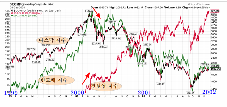 참고로 2000년 IT 버블이 붕괴된 후 나스닥이 5000에서 1200으로 1/4 토막으로 하락하는 동안 건설업 주가지수는 300%가 올랐다. 만일 그 때 기술주 버블에 동참하지 않았던 워런버핏이 건설업 주식을 샀다면 지금보다 훨씬 더 부자가 될 기회였다.