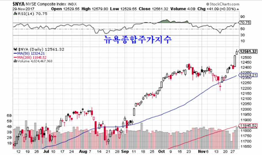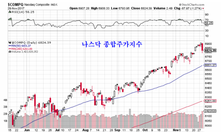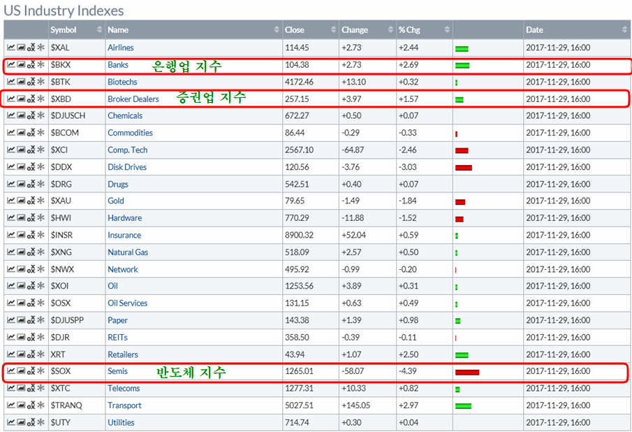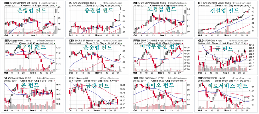 11월 월말 미국 증시에서는 굴뚤 산업 중심의 뉴욕증시가 크게 오른 가운데 기술주 비중이 높은 나스닥 지수가 하락하는 변화가 나타났다.