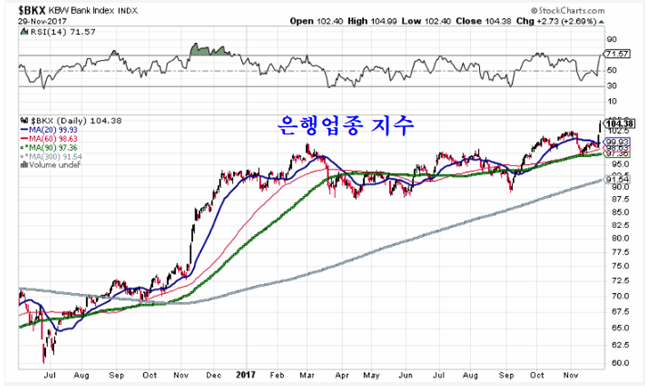 2016년 12월 이후 1년여에 걸쳐 긴 박스권 조정을 거쳤던 은행업종은 이틀에 걸친 급등과 함께 11월초 하락폭을 만회하고 연중 신고가를 기록했다.