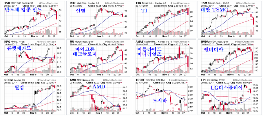 따라서 이들 기업의 천정권 하락은 향후 비트코인 등 소위 가상화폐의 하락의 전주일지 모른다. 향후 비트코인과 함께 하락이 시작된다면 반도체와 비트코인은 상호 영향을 미치면서 함께 하락할 수 있다.