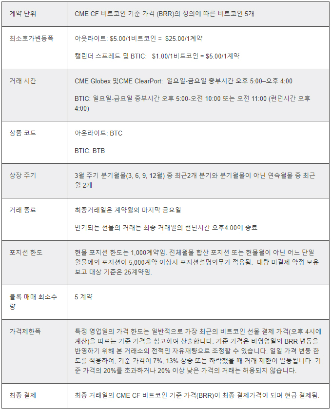 < 시카고상품거래소(CME) 비트코인 상품 명세서 >