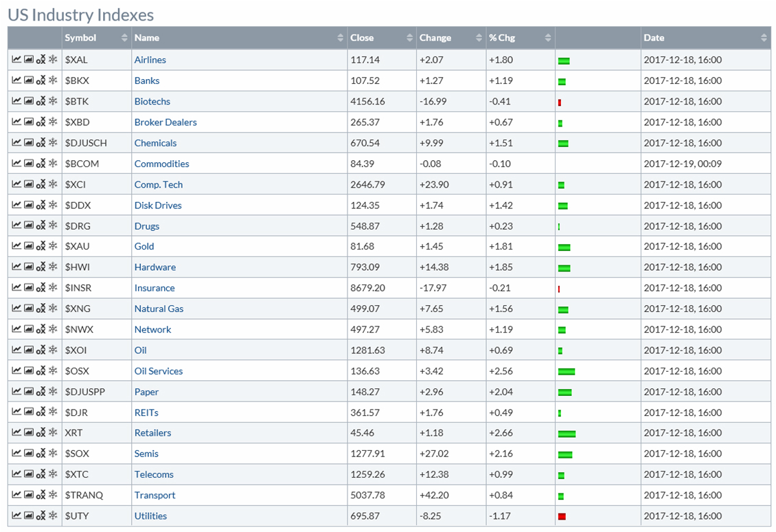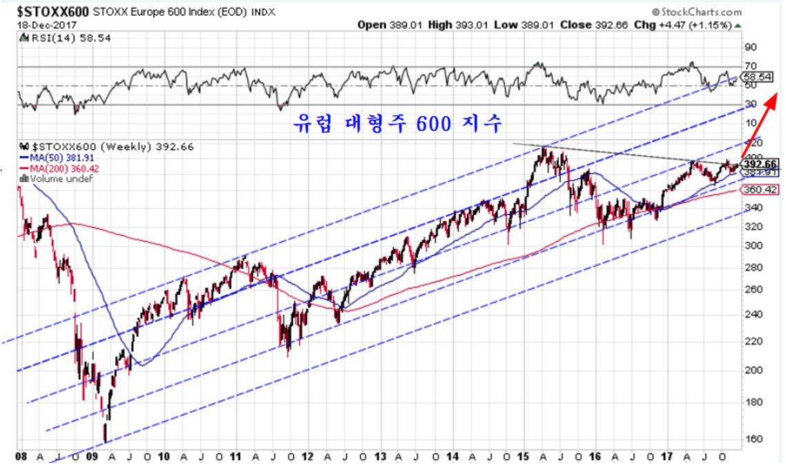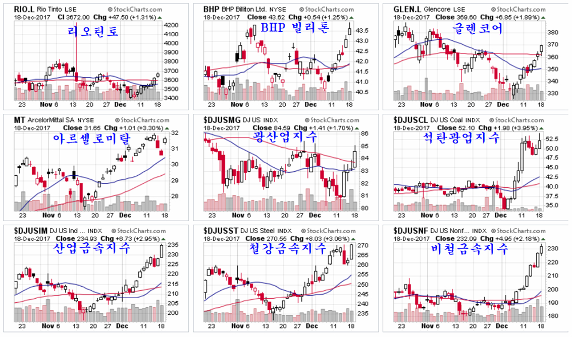 2016년 빠른 상승 이후 2017년 상승의 보폭을 줄이며 조정을 거쳤던 광업과 금속산업이 2018년 본격적인 상승이 준비되는 듯 하다. 광산업의 상승을 굴뚝 경기의 맨 선두에 선 업종의 상승으로 관련 산업의 호전을 예고하므로 이 흐름을 주목하면 좋다.