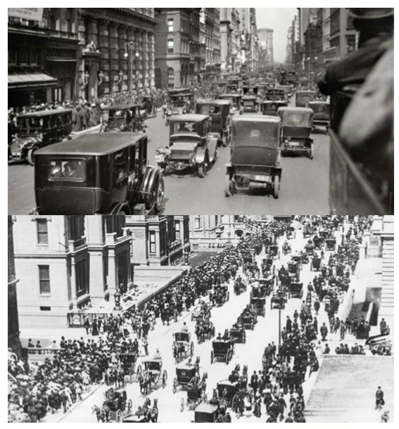 < (위) 1913년 뉴욕 자동차 / (아래) 1900년 뉴욕 마차 >