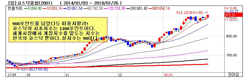 위 그림은 코스닥지수이다. 한국의 코스닥지수는 세계거래소시장 중에서 유일하게 시초개장지수를 밑도는 지수이다. 현 900포인트를 넘었다고 떠드는 사람들이 있으나 사실은 90포인트임을 알아야한다. 수치만 10배로 뻥튀기한 것이다. 시초가 지수가 현 10배 뻥튀기한 지수로 표현한다면 1,200포인트이기 때문에 그 지수를 넘어선후에 올랐느니 떨어졌느니 얘기를 해야한다는 것이다.