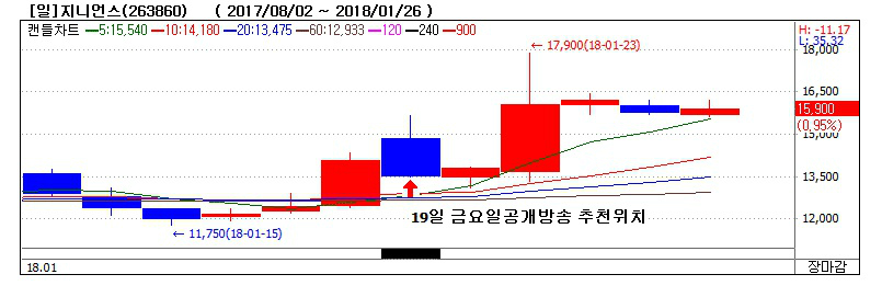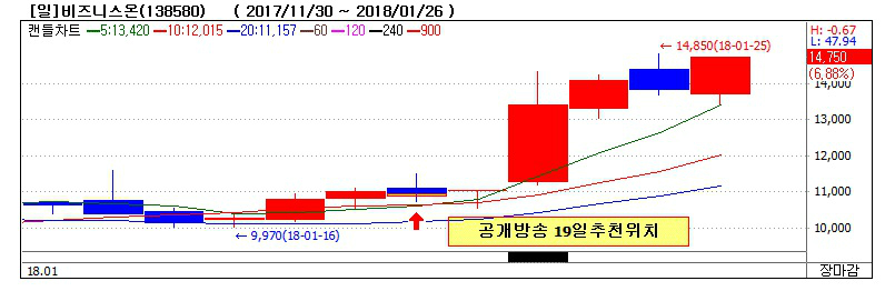 지난 1월19일 공개방송에서 9종목을 추천하여 5종목은 당일중 수익실현 또는 손절매도하고 지니언스,인크로스,비즈니스온,티슈진은 손절선을 잡아주면서 홀딩을 추천하였다. 인크로스와 티슈진도 올랐지만 지니언스와 비즈니스온은 상한가폭이상 상승하였다. 언제나 그렇지만 공개방송에서 준 종목을 전부 고르게 매수하여 손절선을 잡아주므로 손절선을 지키면 반드시 큰 수익이 됩니다. 참여하신분들이 모두 증인이십니다.