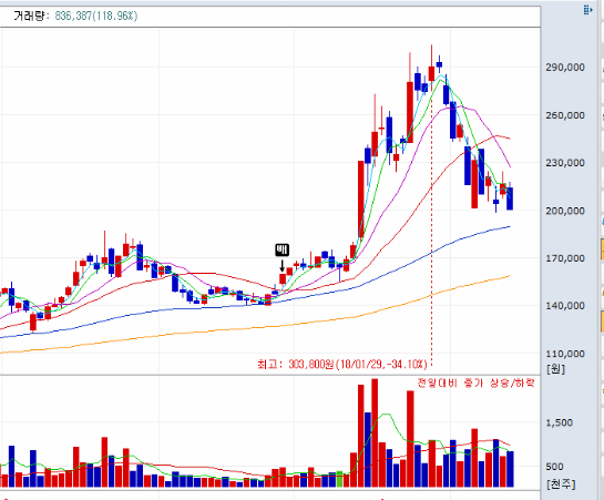 60일이평이 침해하면 하락세로 돌아선 것으로 판단하지만