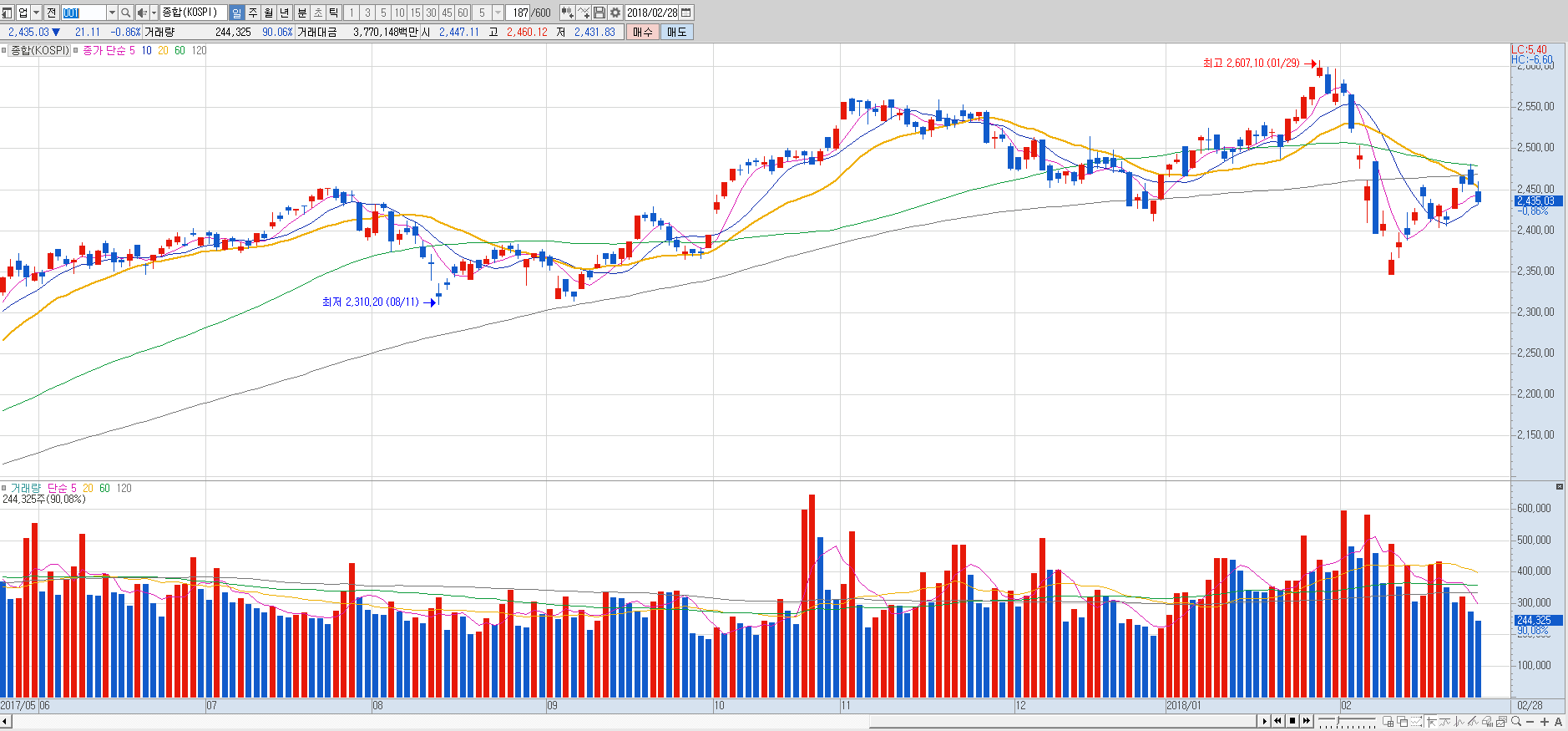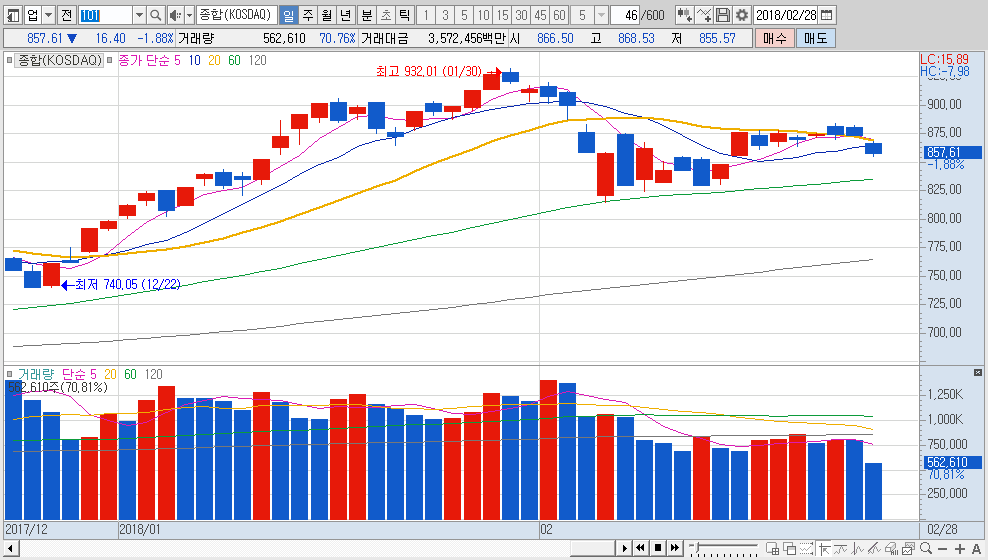 코스닥 시장의 분위기가 좋지 않은 가운데서 품절주 등의 이상급등현상도 나오고 있기 때문에 관련종목들의 주가 변동성 위험에 주의를 기울여야 할 시장입니다.