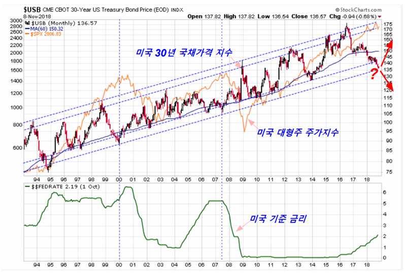 이런 이유 때문에 30년 채권가격이 채널의 하단에 닿아 있는 2018년 현재 채권가격이 반등하면서 주가가 하락할 것이라고 생각하는 증시 전문가나 투자자도 있을 듯 하다.