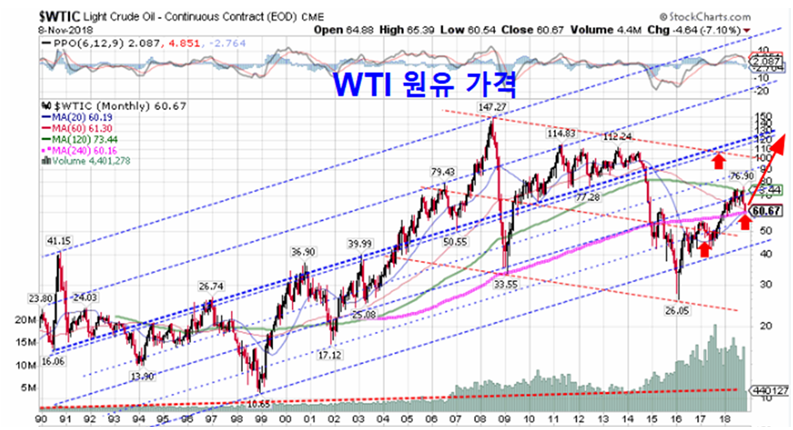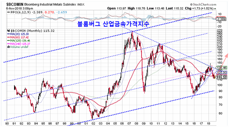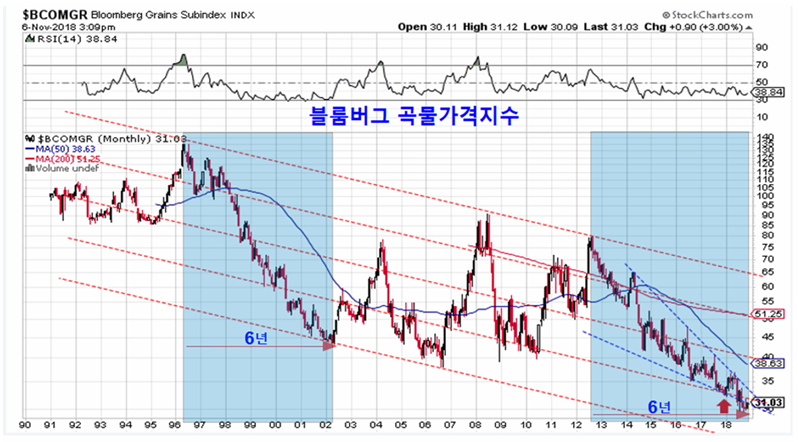 단기적으로는 상품가격이 하락했지만 장기적으로는 상품가격은 크게 오를 조건을 갖추고 있다. 6년 하락을 거쳐 상승이 준비되는 곡물가격과, 2016년 이후 상승이 진행되다가 2018년 조정을 거쳐 다시 추세를 회복하는 (산업용) 금속가격, 그리고 20년 평균까지 조정을 거쳐 상승이 준비되는 원유가격을 감안하면 장기적으로 매우 길고 강한 상승 추세를 예상할 수 있다.