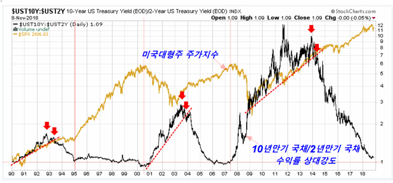 한편으로 장기금리와 단기금리의 비율을 통해 주가의 전환점을 판단하는 경우도 많다. 그림에서 보는 것처럼 보통은 장기금리가 단기금리보다 높게 형성되기 때문에 10년 국채 금리를 2년 국채금리로 나누면 1보다 큰 값을 가지며 이 값은 경기가 호전될수록 장기금리와 단기금리 사이의 비율이 줄어 1.0에 수렴한다.