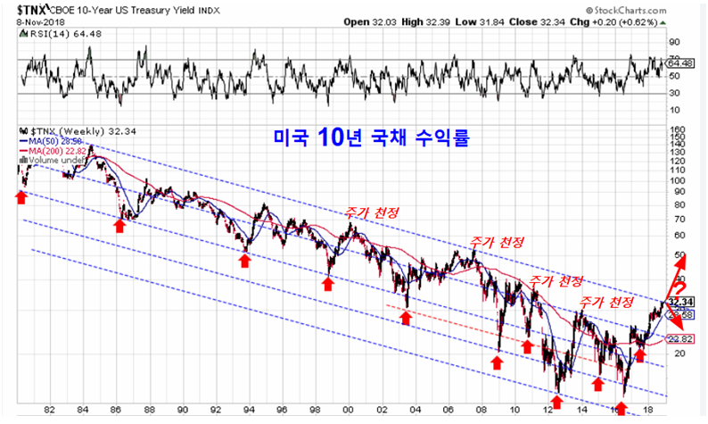 기술적으로 보면 영락없이 하락으로 전환하는 위치로 보인다. 그러나 채권가격을 결정하는 원인을 고려하면 채권수익률은 30년의 저항의 추세를 돌파하여 새로운 상승 추세를 형성하기 쉽다.