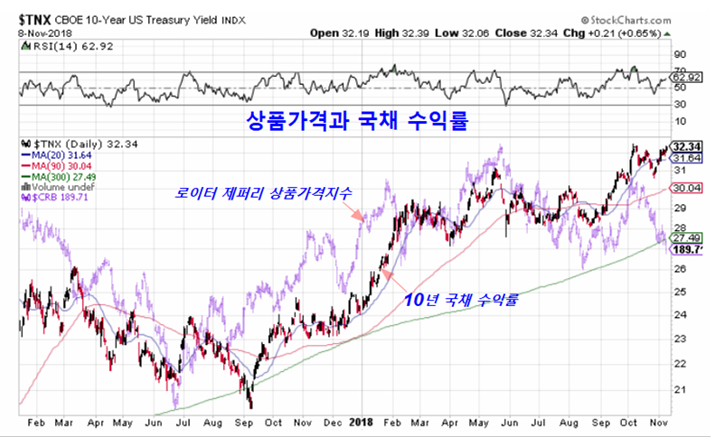장기로 보면 국채 가격은 물가의 영향을 받아 움직인다. 물가상승은 화폐가치의 하락을 의미하기 때문에 액면 화폐의 가치를 갖는 채권가격의 실질가치를 하락시킨다. 따라서 원자재 가격이 오르면서 물가가 오르면 채권가격이 하락하며 실질가치 하락을 보상하기 위해 채권 수익률은 오르게 된다.