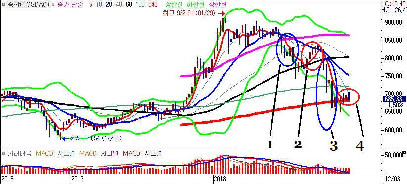 추가하락은 피할수 없을듯하며 추가하락이 나타날경우 도달할수 있는 코스닥 지수의 단기반등은