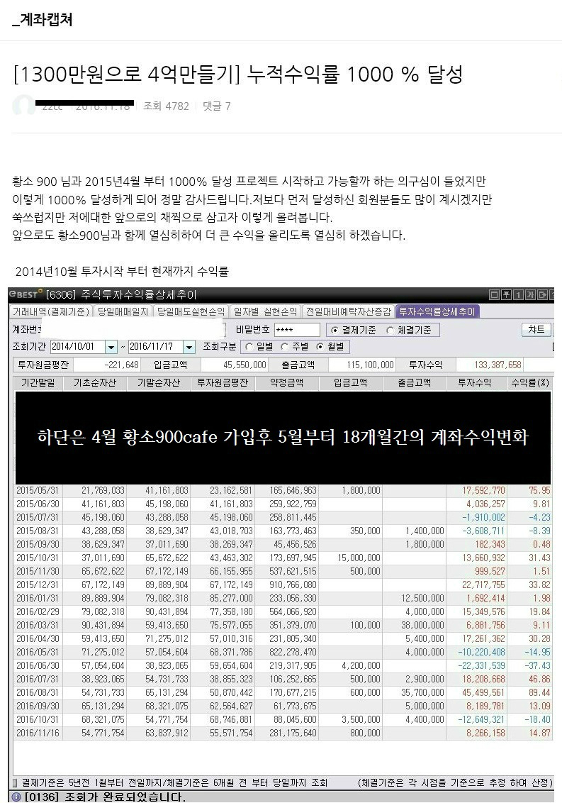 이걸 믿어야만 계좌라는 미인이 돌아올때까지 인내하고 인내하고 인내하면서 참고 참을거 아닙니까? 아니라고요 ? 그럼 18개월을 인내하고 인내하고 인내해서 참고 참아 18개월만에 1300만원으로 1억 3300만원을 번 우리 회원은요 ? 그 회원이 그러는동안 어떤 분은 1억 3300만원으로 18개월만에 1300만원이 된 개인투자자도 있을수 있잖아요? ..