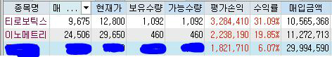 공개방송에서 3일동안 강력하게 추천한 이노메트리, 티로보틱스가 20~30%수익을 내주고 있고,