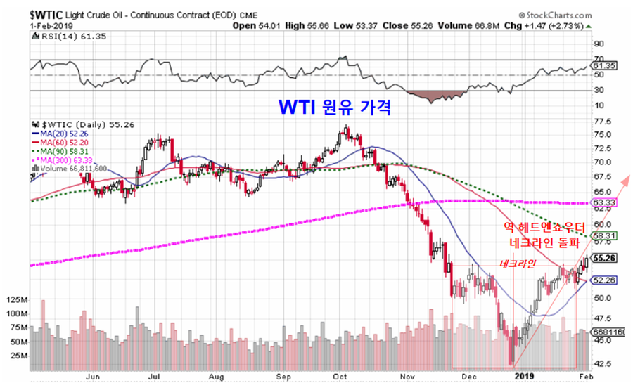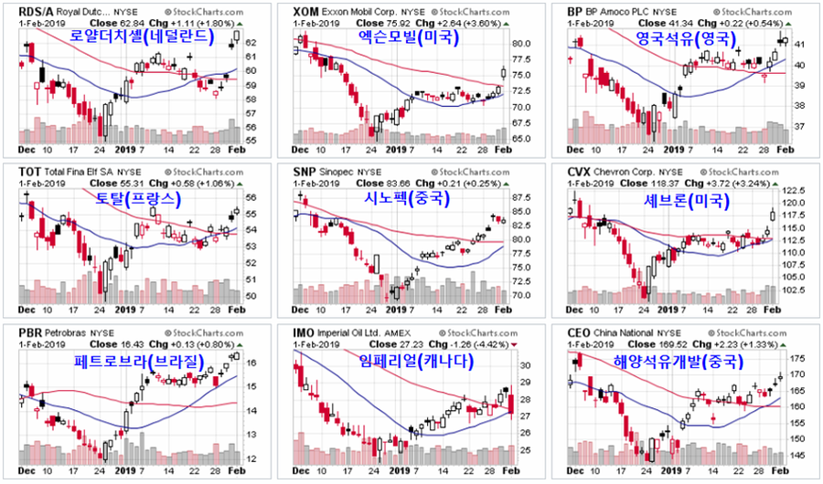 특히 1월 중순 이후 긴 조정이 이어졌던 상품을 대표하는 원유의 가격이 1월 마지막주 상승 국면이 시작되었다. 이와 함께 조정을 받던 세계의 석유기업들이 충분한 체력을 비축하고 상승이 시작되어 있다.