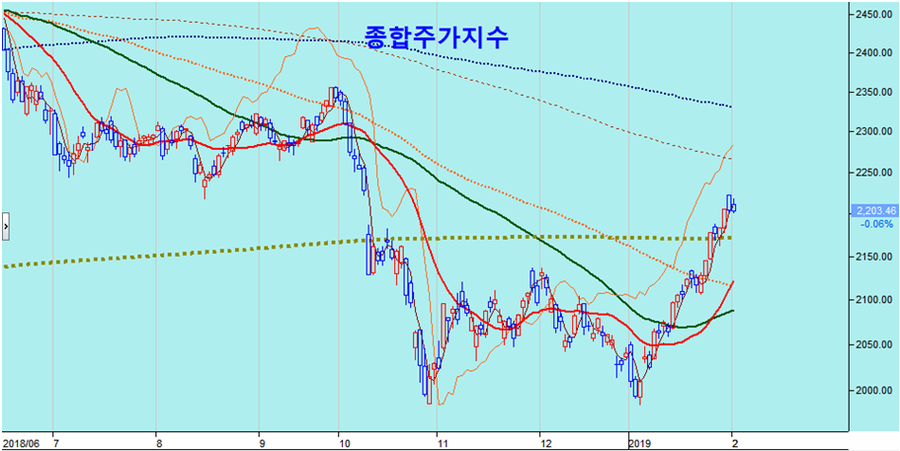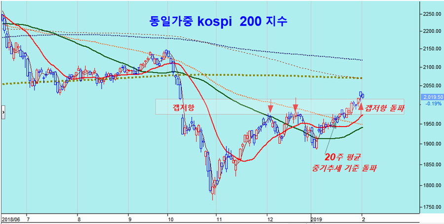 삼성전자의 시가총액 가중효과를 뺀 동일가중 kospi 200 종목 지수는 2018년 10월 30일을 최저가격으로 하여 3개월째 점진적인 상승이 이어지고 있다. 1월 중순 20주 평균 중기 추세를 돌파하여 상승 추세 국면이 시작되니 이후 지난해 10월 갭저항을 돌파함으로써 본격적인 상승 추세로 진입하였다.